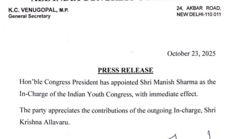 Read More »नई दिल्ली 23 अक्टूबर । बिहार में कांग्रेस के प्रभारी और युवा कांग्रेस के राष्ट्रीय प्रभारी कृष्णा अल्लावरू के स्थान…