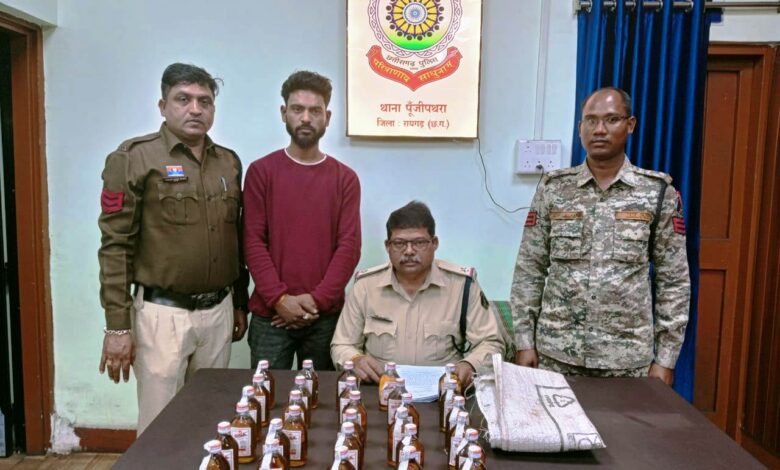 रायगढ़, 18 फरवरी। पूंजीपथरा पुलिस ने आज ग्राम तराईमाल स्थित ‘अपना ढाबा’ में छापा मारकर अवैध रूप से बेची जा रही अंग्रेजी शराब बरामद की। इस कार्रवाई में पुलिस ने आरोपी को मौके से गिरफ्तार कर उसके कब्जे से 30 पाव गोवा स्पेशल व्हिस्की जब्त की, जिसकी कुल मात्रा 5 लीटर 400 मिली और कीमत 3,900 रुपये आंकी गई है।