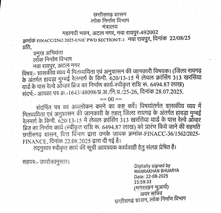 खरसिया, 23 अगस्त 2025। खरसिया रेलवे यार्ड के पास वर्षों से लंबित रेलवे ओवरब्रिज (आरओबी) का निर्माण अब शुरू होने की दिशा में बड़ा कदम बढ़ा है। छत्तीसगढ़ शासन के वित्त विभाग ने आखिरकार इस परियोजना को सहमति दे दी है। करीब 6494.87 लाख रुपये की लागत वाली इस परियोजना को लेकर वित्त विभाग करीब डेढ़ साल से अनुमति देने में टालमटोल कर रहा था। लेकिन खरसिया विधायक उमेश पटेल के अथक संघर्ष और कांग्रेसियों के निरंतर दबाव के बाद भाजपा सरकार को झुकना पड़ा और वित्त विभाग को आरओबी निर्माण कार्य शुरू करने की सहमति देनी पड़ी। इस संबंध में छत्तीसगढ़ शासन, लोक निर्माण विभाग ने प्रमुख अभियंता (लोक निर्माण विभाग), नवा रायपुर को पत्र जारी कर सूचित किया है कि जिला रायगढ़ के अंतर्गत हावड़ा–मुंबई रेलमार्ग के किमी 620/13–15 पर लेवल क्रॉसिंग 313, खरसिया यार्ड के पास प्रस्तावित रेलवे ओवरब्रिज (स्वीकृत राशि रु. 6494.87 लाख) को प्रारंभ करने की सहमति वित्त विभाग द्वारा दी गई है। उक्त पत्र अवर सचिव मनराखन भूआर्य द्वारा जारी किया गया है। इसके साथ ही वर्षों से ठप पड़ी परियोजना को गति मिलने की उम्मीद है। यह मंजूरी केवल एक परियोजना का आरंभ नहीं, बल्कि शहीद नंदकुमार पटेल के उस अधूरे सपने की पूर्ति है जिसे उनके बेटे और खरसिया विधायक उमेश पटेल और खरसिया विधानसभा के कांग्रेसियों ने हर मोर्चे पर लड़कर साकार किया है।