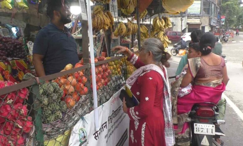 शारदीय नवरात्रि के प्रारंभ होते ही नगर में फलों की डिमांड भी बढ़ने लगती है और त्योहारी सीजन में आमतौर पर फलों के दामों में भारी उछाल देखा जाता है, लेकिन इस बार फलों के दामों में थोड़ी बहुत ही बढ़ोतरी देखने को मिल रही है फिलहाल बाजार में सेब 100 से 120 रुपए किलो तक बिक रहा है, वहीं केला 50 से 60 रुपए,दर्जन ,ऐवाकाडो 100 रुपया नग ,जापानी आम 600 रुपये किलो ,थाईलैंड का अंगूर लाल वाला 600 रुपये तो लाल वाला 400 रुपये किलो दर्जन तक मिल रहा है। देशी फलोंकी कीमतों में इस मामूली बढ़त से ग्राहकों को थोड़ी राहत मिली है वही इस बार बाजार में देसी फलों के साथ-साथ विदेशी फलों की मांग भी बढ़ गई है। ड्रेगन फ्रूट, एवोकाडो और विदेशी तेंदू जैसे फल ग्राहकों को आकर्षित कर रहे हैं। इतना ही नहीं थाईलैंड से आए सेब भी बाजार में अच्छे बिक रहे है