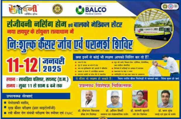 11 व 12 जनवरी को निःशुल्क कैंसर जांच व परामर्श शिविर का भव्य आयोजन ,बाल्को मेडिकल सेंटर नवा रायपुर व संजीवनी नर्सिंग होम की अभिनव पहल