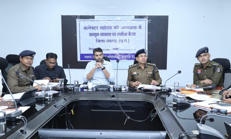 रायगढ़, 25 फरवरी 2026। जिले में कानून व्यवस्था को और अधिक सुदृढ़ एवं प्रभावी बनाने के उद्देश्य से आज कलेक्टोरेट सभा कक्ष में कलेक्टर एवं जिला दण्डाधिकारी श्री मयंक चतुर्वेदी तथा वरिष्ठ पुलिस अधीक्षक श्री शशि मोहन की संयुक्त अध्यक्षता में समीक्षा बैठक आयोजित की गई। प्रातः 11 बजे प्रारंभ हुई बैठक में कानून व्यवस्था से जुड़े 16 महत्वपूर्ण एजेंडों पर विस्तारपूर्वक चर्चा करते हुए संबंधित विभागों के अधिकारियों को स्पष्ट एवं सख्त निर्देश दिए गए।